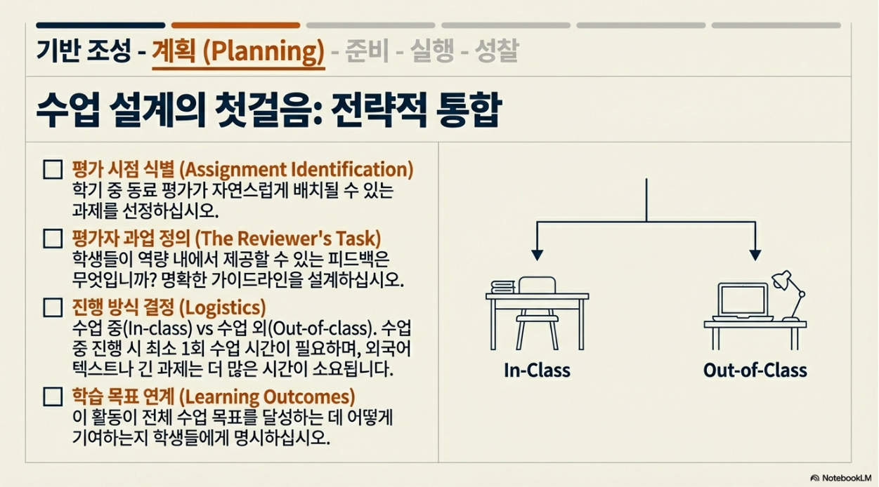 - 학생 역량 고려: 학생들이 역량 있게 제공할 수 있는 피드백의 수준과 종류가 무엇인지 사전에 검토한다.
