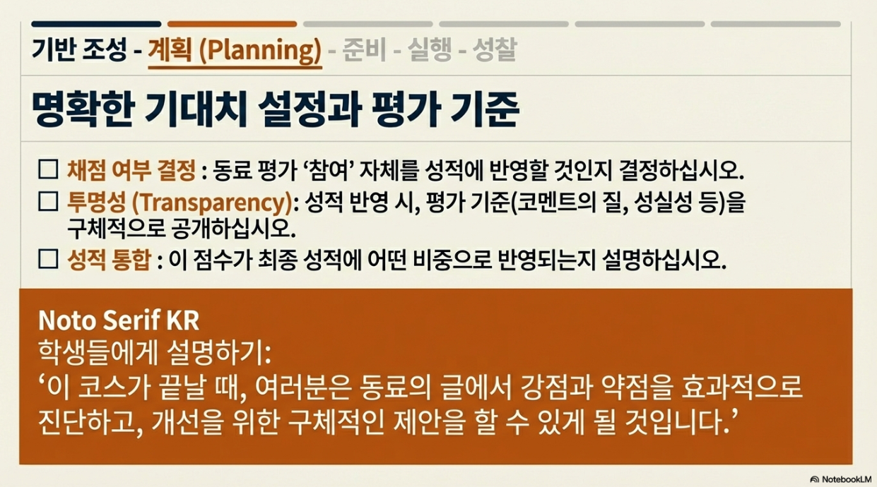 - 근거 및 혜택 설명: 상호 평가를 실시하는 이유와 그것이 코스 학습 목표를 어떻게 지원하는지 학생들에게 명확히 설명한다.