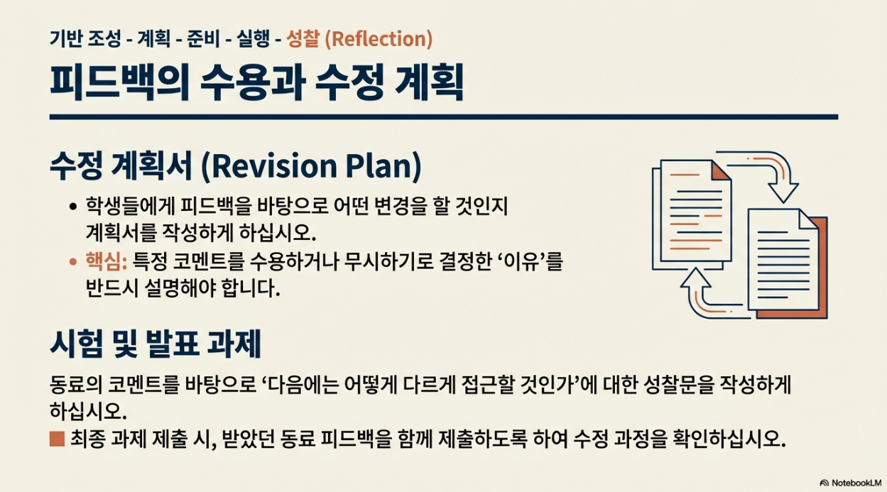 - 수정 계획(Revision Plan) 작성: 학생들이 받은 피드백 중 어떤 것을 반영하거나 무시할지, 그 이유는 무엇인지 설명하는 수정 계획서를 작성하게 한다.